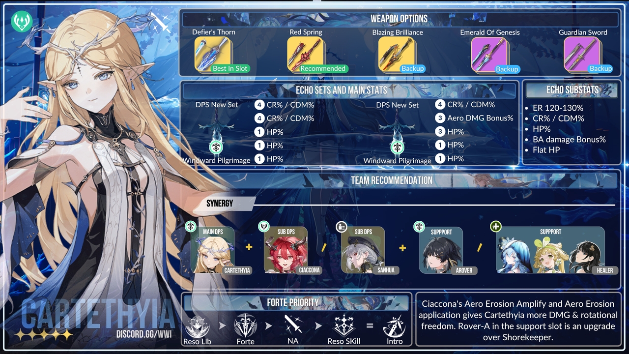 Signature weapon milik Cartethyia adalah pilihan terbaik yang benar-benar cocok untuk kit-nya. Senjata ini memberikan peningkatan HP% dalam jumlah besar, yang sangat penting untuk memaksimalkan performanya. Selain itu, efek pasif tambahan berupa 8% DEF Ignore dan 20% peningkatan DMG terhadap musuh yang terkena Aero Erosion membuat senjata ini unggul jauh dibanding opsi lain — satu-satunya senjata yang benar-benar memenuhi semua kebutuhan Cartethyia.