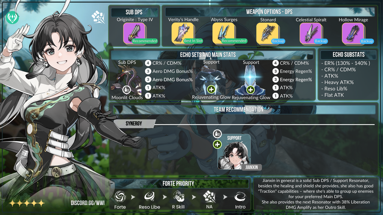 Salah satu pilihan Gauntlet terbaik di game ini dengan satu-satunya pesaing adalah senjata ⭐4 dengan beberapa dupe. Memberikan base ATK yang tinggi, ATK%, jumlah EnergY Regen yang baik untuk menyimpan setidaknya 1 sub-stat pada echo yang dapat dipindahkan ke penggunaan yang lebih baik, dan bonus bersyarat yang meningkatkan damage Resonance Skill dan Basic Attack yang sangat mudah dipenuhi.