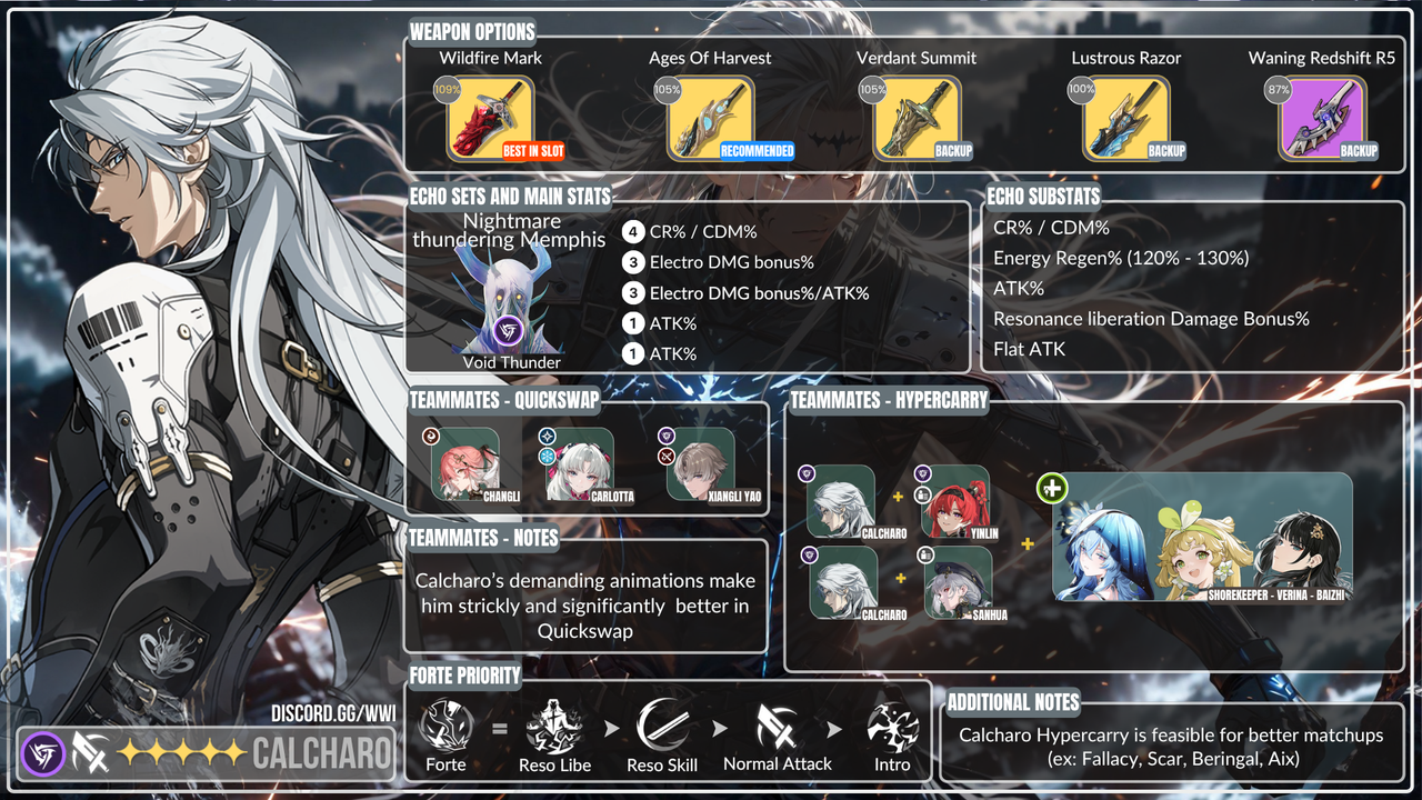 Pilihan yang sangat kompetitif untuk senjata terbaiknya jika kamu tidak mendapatkan senjata tersebut dari banner standar. Base ATK yang tinggi, serta 24% Crit Rate dan 12% DMG bonus attribute sangat bagus, terutama jika kamu perlu senjatamu untuk menyeimbangkan rasio crit-mu, dalam build tersebut senjata ini bisa lebih unggul dibandingkan Lustrous Razor. Meskipun Resonance Skill hampir tidak digunakan sama sekali di Calcharo, Resonance Skill DMG boost selalu memberikan sedikit peningkatan damage.