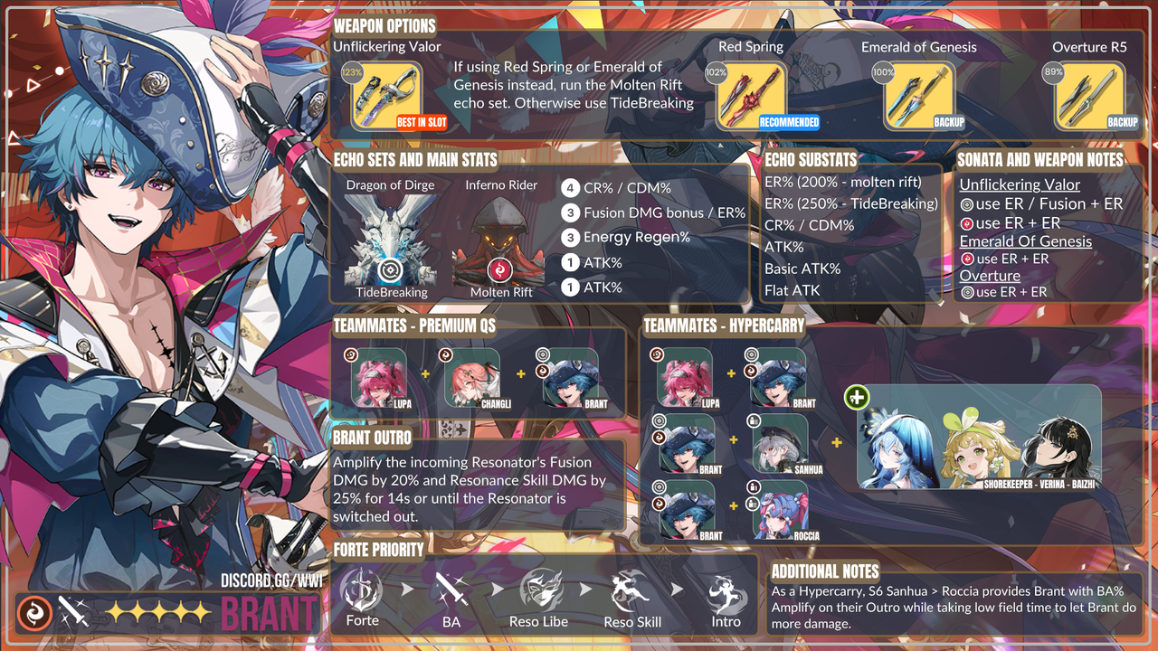 Tapi kalau kamu bisa pull semuanya, boost damage dari stat Energy Regen besar yang dimiliki Sword ini, ditambah bonus dari set Tidebreaker dibanding opsi lain, bikin weapon ini jadi pilihan yang cukup kompetitif. Sayangnya, efek Concerto dari weapon ini nggak ada gunanya karena rotasi Brant fokus ke Forte gauge, bukan ke concerto atau energy.