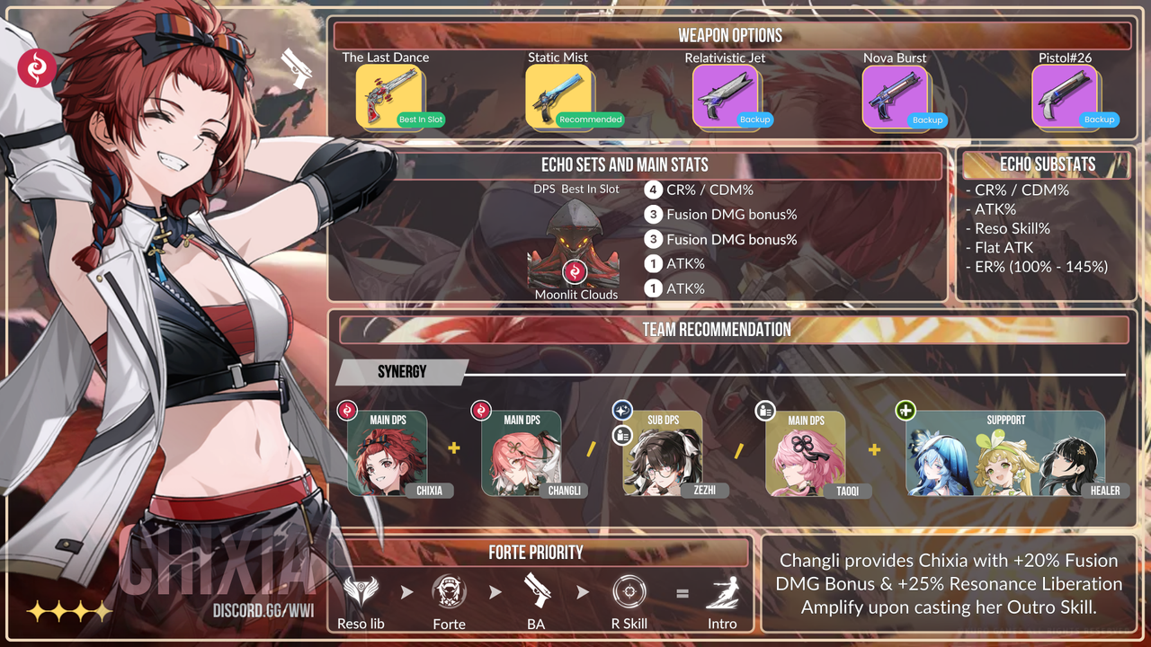 Signature Carlotta dan pilihan yang solid untuk sebagian besar pistol-based resonators berkat base damage yang cukup baik, Crit DMG% yang sangat tinggi, dan permanent ATK% boost. Namun, senjata ini jauh lebih efektif untuk resonators yang sebagian atau sebagian besar damage-nya berasal dari kemampuan Resonance Skill.