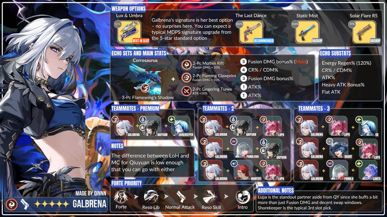 Pilihan weapon 5-star dari banner standar ini sangat cocok untuk Galbrena, dengan pasif yang dimanfaatkan sepenuhnya dalam tim Mono Fusion untuk memberi buff damage ke karakter berikutnya (seperti Lupa), sekaligus tetap berguna secara umum berkat Base ATK tinggi, CRIT Rate, dan Energy Regen-nya di berbagai komposisi tim. Hal ini membuatnya tidak mengalami penurunan performa yang signifikan dibanding Signature Weapon-nya, terutama karena Galbrena tidak wajib menggunakan signature weaponnya untuk menyelesaikan konten endgame — cukup dengan Static Mist, asalkan didukung oleh rekan tim yang solid.