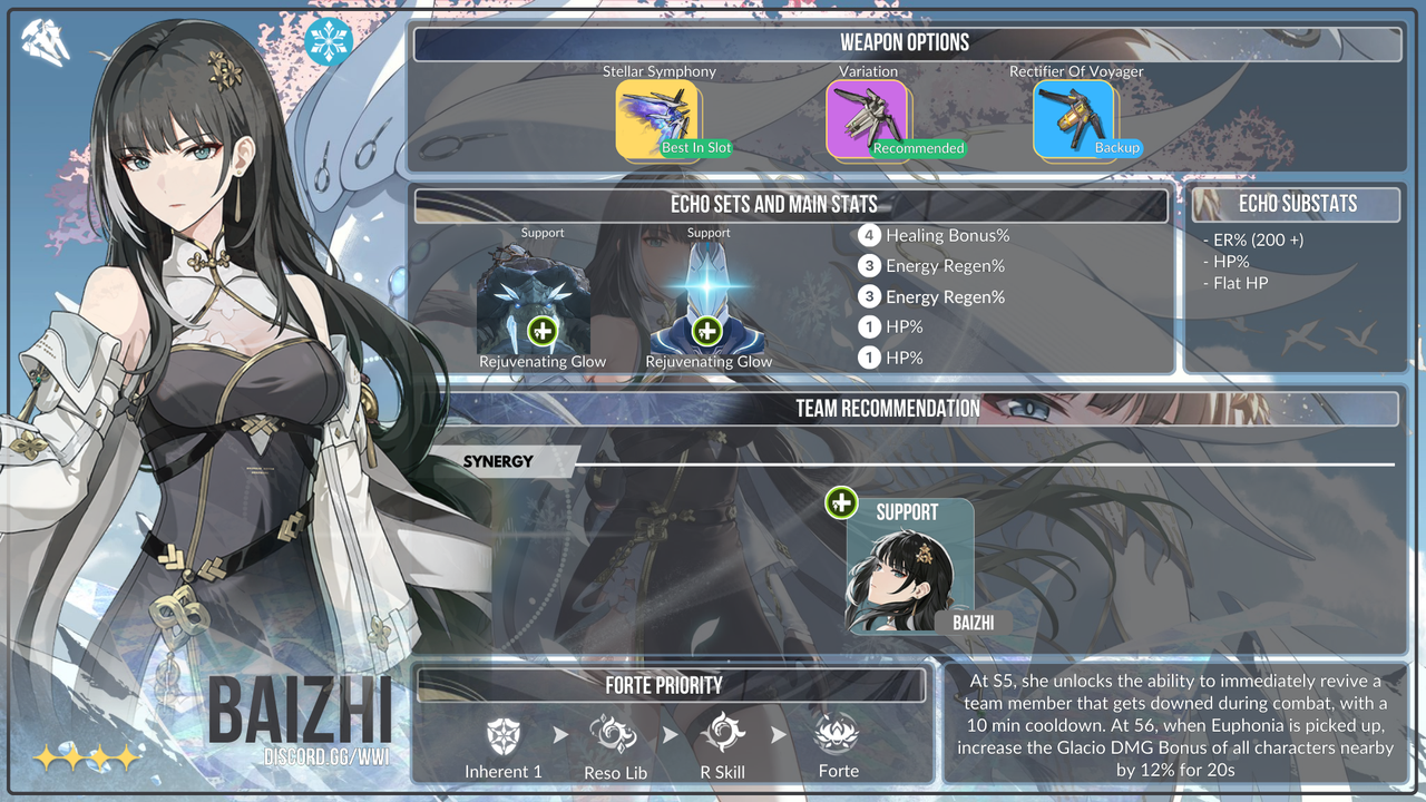 Senjata siganture Shorekeeper tidak hanya menakjubkan untuk Baizhi tetapi juga untuk semua Rectifier Support. Memberikan Energy Regen dalam jumlah yang luar biasa sebagai stat sekundernya, meningkatkan HP karakter yang dilengkapi sekaligus menyediakan Concerto Energy tambahan saat menggunakan Ultimate. Akan sangat berharga untuk semua support unit yang dapat menggunakan senjata tersebut. Senjata ini juga menyediakan buff ATK untuk seluruh tim jika karakter melancarkan Resonance Skill. mengetahui bahwa Baizhi juga bisa melakukan healing dengan Resonance Skill nya, ini membuat senjata ini menonjol sebagai senjata pendukung yang menakjubkan.