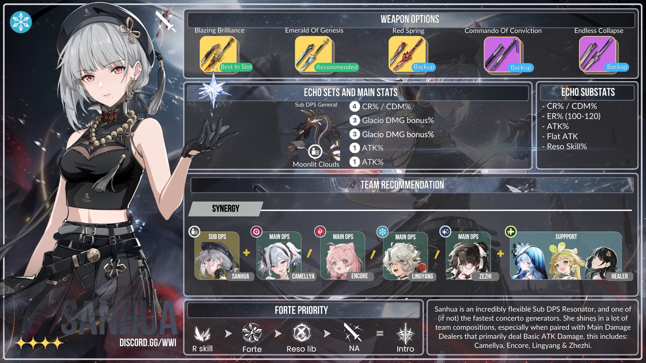Senjata Sword serbaguna yang luar biasa, mendapatkan bonusnya hampir tanpa syarat karena sebagian besar Resonators hampir selalu berusaha memanfaatkan Intro skill mereka, dan hanya sedikit karakter yang menghabiskan lebih dari 15 detik di pertarungan selama durasinya.