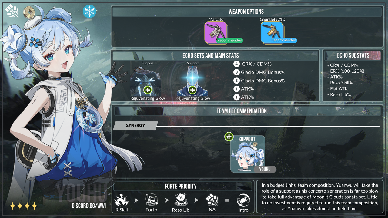 Senjata terbaik untuk Youhu berkat main stat Energy Regen yang sangat besar dan Concerto generation, memungkinkan Youhu mengakses Outro jauh lebih mudah. Merupakan pilihan utama di S1 atau S5, namun semakin banyak duplikat yang dimiliki, semakin senjata ini dapat bersaing dengan senjata lain