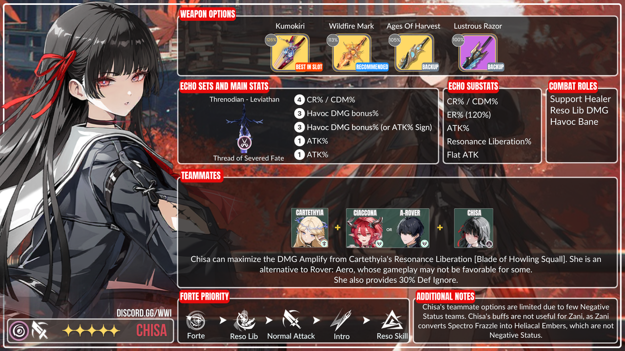 Signature Lupa berperan baik dalam kit Chisa karena memberikan status damage yang tinggi dan Resonance Liberation DMG Bonus yang memungkinkannya mempertahankan personal damage yang baik. Namun, dia kehilangan potensi buff tim dengan senjata ini.