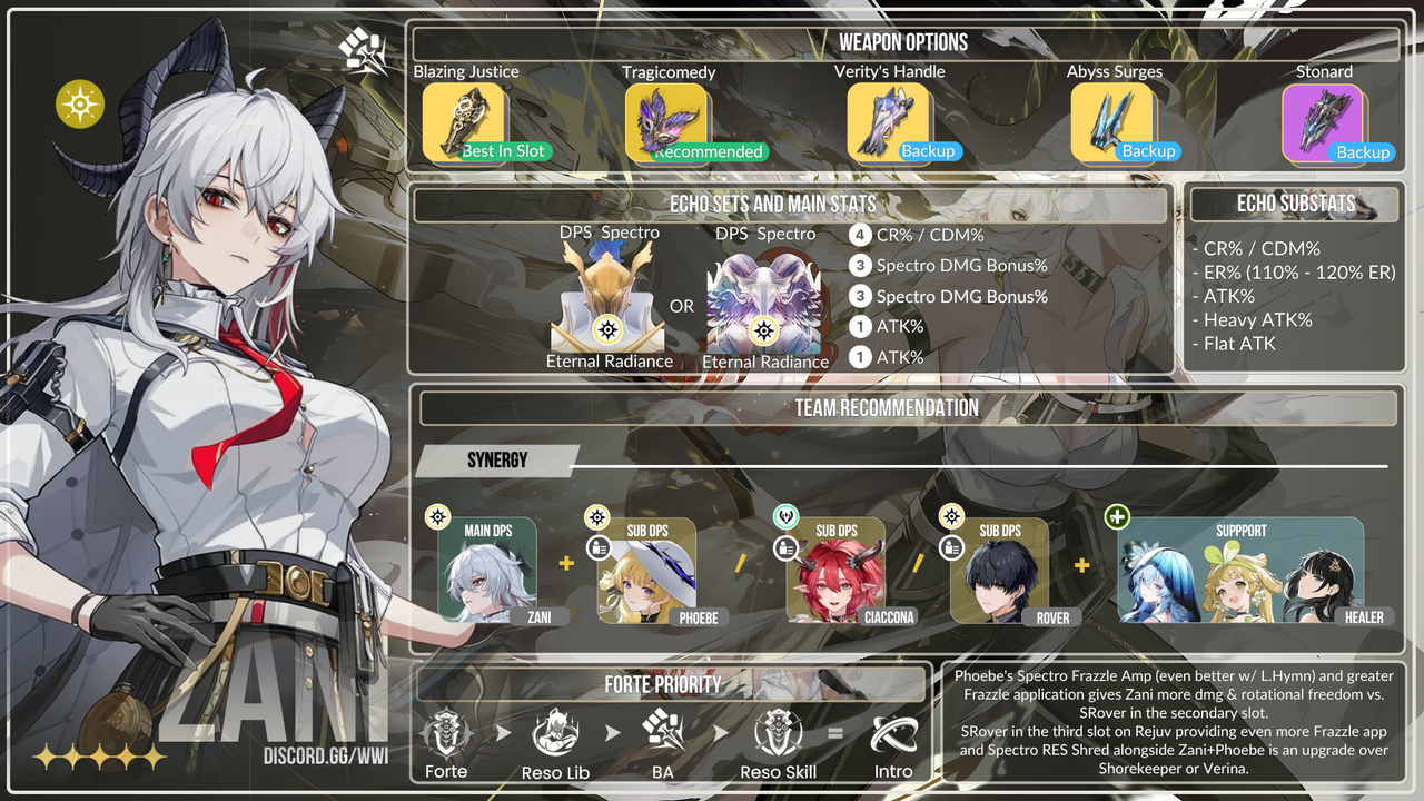 Signature weapon milik Zani sejauh ini merupakan opsi terbaiknya, berkat peningkatan besar pada statistik terbaiknya: 48,6% CRIT DMG dengan Base ATK yang tinggi, 50% Spectro Frazzle Amplify, tambahan 12% ATK, dan bahkan 8% DEF Ignore dengan syarat sederhana (yang hampir bisa terus-menerus dipicu sepanjang rotasi Zani). Seberapa kuat senjata ini dibandingkan opsi lain tergantung pada seberapa banyak sumber Frazzle Amplify lain yang kamu miliki. Sebagai contoh, saat Phoebe mengaktifkan 100% Frazzle Amplify, nilai dari senjata ini sedikit berkurang karena efek dilusi, tetapi tanpa buff tersebut, senjata ini menjadi jauh lebih kuat.