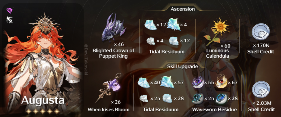 Glory's Favor Saat Augusta memberikan damage, ia mendapatkan Shield sebesar 350 + 2,5% dari HP Maksimalnya selama 5 detik, dengan pemicu maksimal sekali setiap 0,5 detik. Efek ini tidak dapat diakumulasi dan tidak ditransfer ke Resonator pengganti.