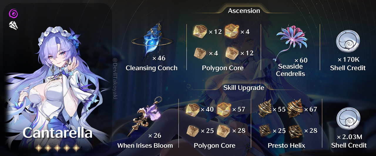 Abyssal Rebirth Setelah melancarkan Intro Skill, Cantarella memasuki Abyssal Rebirth, yang berlangsung selama 25 detik dan dapat diaktifkan sekali setiap 25 detik. Selama durasi ini, hingga 6 kali, ketika Resonator dalam tim melancarkan Echo Skill, Cantarella memulihkan 6 poin Concerto Energy. Echo dengan nama yang sama hanya dapat memicu efek ini sekali. Saat berada di air, kecepatan berenang Cantarella meningkat dan biaya STA berkurang.